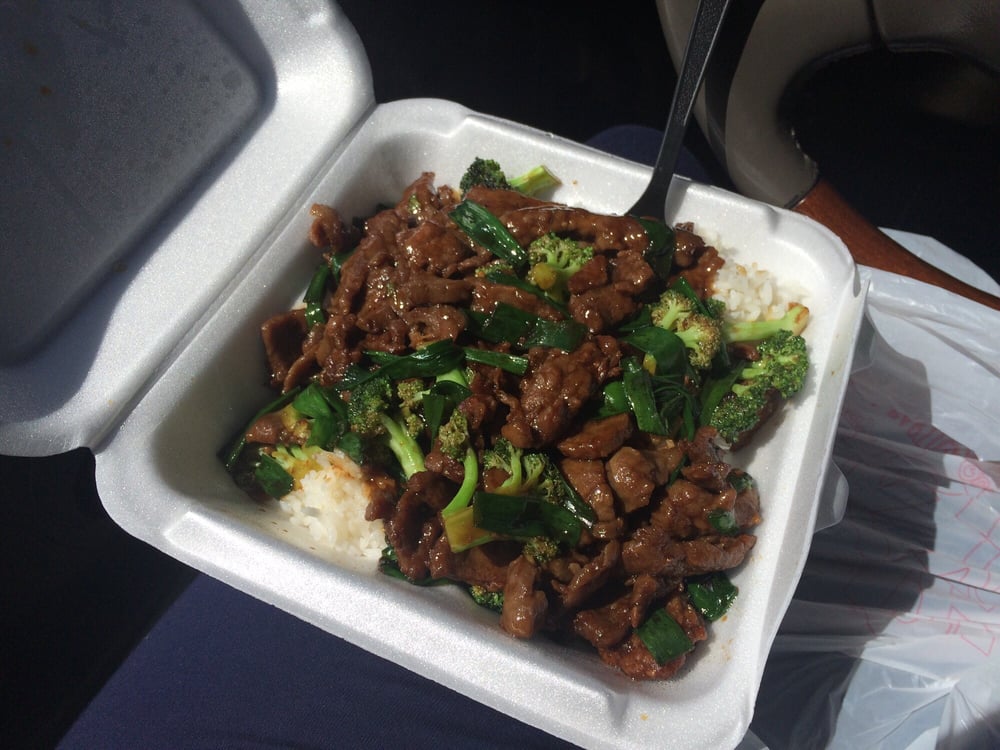 Beef, mushrooms, and vegetables. Options for size: combo or large. Rice choices: steamed, fried, or lo mein.